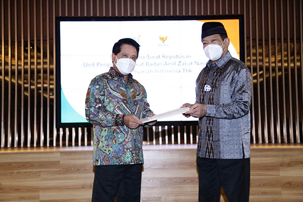 Direktur Utama PT Bank Syariah Indonesia Tbk, Hery Gunardi (kiri) menerima Surat Keputusan Unit Pengumpul Zakat BAZNAS PT Bank Syariah Indonesia Tbk sekaligus penetapan Penasehat dan Pengurus UPZ BAZNAS BSI periode 2021-2026 dari Ketua BAZNAS, Noor Achmad di Jakarta, Kamis 20 Mei 2021. Dengan diresmikannya UPZ BAZNAS PT Bank Syariah Indonesia Tbk diharapkan dapat menjadi salah satu lembaga zakat pilihan masyarakat dalam menghimpun, mengelola, dan menyalurkan zakat untuk mengootimalkan potensi ZISWAF dan meningkatkan pemberdayaan ekonomi masyarakat.