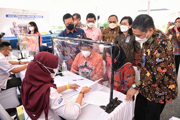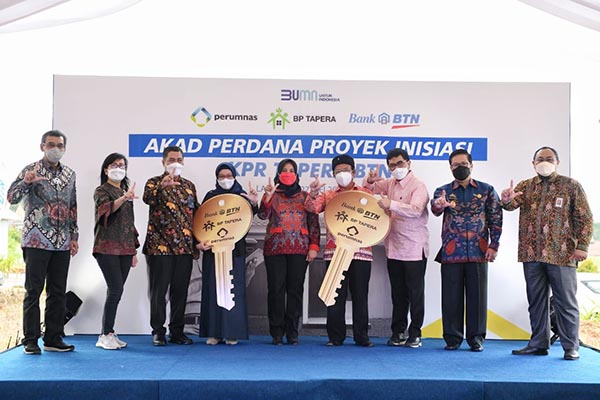 Deputi Komisioner Bidang Pemanfaatan Dana Tapera Ariev Baginda Siregar (tiga kanan) dan Direktur Consumer And Commercial Lending Bank BTN Hirwandi Gafar (tiga kiri), disaksikan Direktur Pemasaran Perum Perumnas Tambok Setyawati (dua kiri) dan Sekda Pesawaran Kesuma Dewangsa (dua kanan) memberikan kunci rumah secara simbolis kepada ASN penerima manfaat program pembiayaan rumah Tapera di Perumahan Samesta Pesawaran Residence Lampung, Kamis, 27 Mei 2021. Permintaan rumah untuk kelompok ASN di wilayah Lampung cukup tinggi. BP Tapera bersama BTN dan Perumnas merealisasikan akad perdana KPR Tapera untuk ASN di Lampung dengan peminat hampir mencapai 200 ASN hanya dalam waktu tujuh hari.