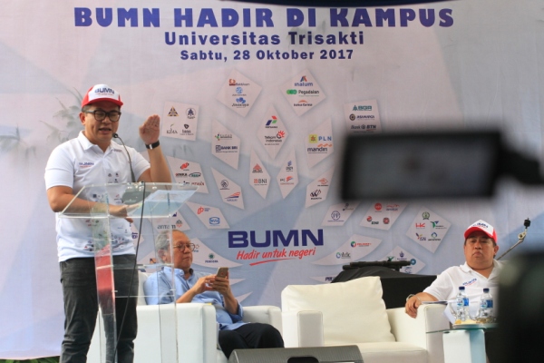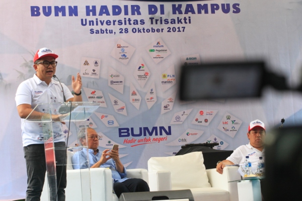 (kika) Guru Besar Univ Trisakti Prof Dadan Umar Daehani, Dirut Bank Mandiri Kartika Wirjoatmodjo, Dirut Timah Mochtar Riza Pahlevi Tabrani, dan moderator Tri Kunawangsih saat menyampaikan sharing tentang kiprah BUMN dalam mendukung agenda pembangunan nasional di Universitas Trisakti Jakarta, Sabtu (28/10). Sebagai implementasi program BUMN hadir di Kampus, jajaran direksi BUMN turun ke universitas-universitas untuk memberikan kuliah umum kepada mahasiswa tentang dukungan BUMN pada pembangunan. Bank Mandiri, misalnya, mendukung pembangunan melalui penyaluran pembiayaan untuk percepatan pengadaan infrastruktur dan pemberdayaan UMKM. (*)