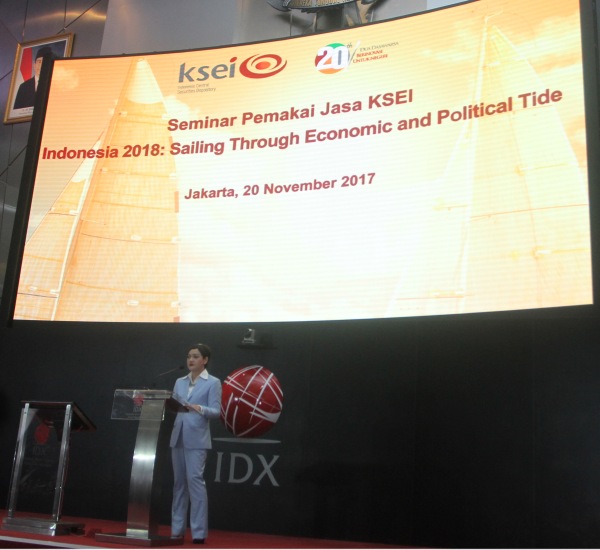 Kepala Kepolisian Negara Republik Indonesia Jenderal (Pol) H. Muhammad Tito Karnavian Ph.d (kanan) menerima kenang-kenangan dari Direktur Utama Kustodian Sentral Efek Indonesia (KSEI), Friderica Widyasari Dewi (tengah) dan disaksikan oleh Direktur Utama Bursa Efek Indonesia, Tito Sulistio (kiri) dalam Sharing Session KSEI: Menyikapi Dinamika Ekonomi dan Politik 2018 yang dihadiri oleh para pemakai jasa KSEI di Main Hall Galeri Bursa Efek Indonesia, Jakarta, Senin (20/11). (*)