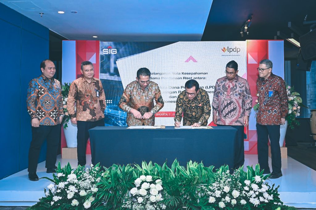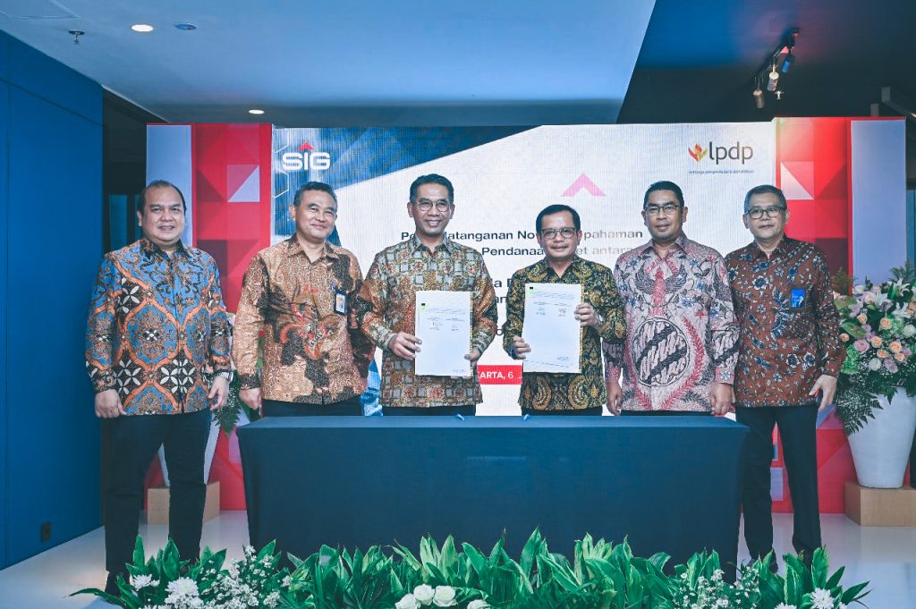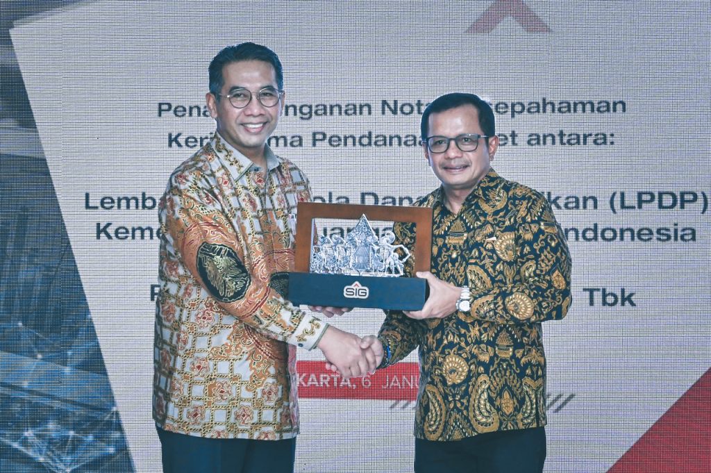 Direktur Utama SIG, Donny Arsal (kanan) menyerahkan cinderamata kepada Direktur Utama LPDP, Andin Hadiyanto (kiri) pada acara Penandatanganan Nota Kesepahaman kerja sama pendanaan riset, di Jakarta.Direktur Utama SIG, Donny Arsal (ketiga kanan) dan Direktur Utama LPDP, Andin Hadiyanto (ketiga kiri) menandatangani Nota Kesepahaman kerja sama pendanaan riset untuk mendukung aktivitas penelitian dan pengembangan sparepart pabrik milik SIG, di Jakarta, akhir pekan lalu.Direktur Utama SIG, Donny Arsal (ketiga kanan) dan Direktur Utama LPDP, Andin Hadiyanto (ketiga kiri) tengah menunjukan Nota Kesepahaman kerja sama yang telah di tandatangani, di Jakarta.