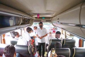 Direktur Utama Semen Indonesia (SIG), Donny Arsal (kiri) memberikan perlengkapan perjalanan kepada peserta mudik saat pelepasan Mudik Sehat Bersama BUMN 2022 di Gelora Bung Karno, Jakarta, Rabu, 27 April 2022. Kegiatan mudik gratis ini merupakan bentuk kepedulian SIG kepada masyarakat yang akan bersilaturahmi dan merayakan idulfitri bersama keluarga dengan aman dan nyaman. Rangkaian kegiatan mudik gratis yang dilaksanakan oleh SIG dimulai pada hari ini 27/04/2022 dengan memberangkatkan 100 pemudik dari Jakarta menuju Purwokerto, Purworejo, Kebumen, Yogyakarta, Madiun, Jombang, Mojokerto, Gresik dan tujuan akhir Surabaya. Selanjutnya pada Jumat 29/4/2022 akan kembali diberangkatkan pemudik dari Banten, Tangerang, Karawang, Jakarta dan Bogor ke sejumlah kota di Jawa Tengah dan Jawa Timur.