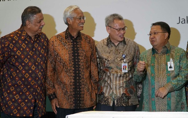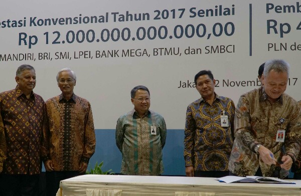 Direktur PT Bank Central Asia Tbk Rudy Susanto (kedua dari kanan), Direktur Utama PT PLN (Persero) Sofyan Basir (kiri), dan Direktur Keuangan PLN Sarwono Sudarto (kedua dari kiri) serta Wakil Direktur Utama Bank Mandiri, Sulaiman A. Arianto (kanan) berbincang usai menandatangani perjanjian kredit sindikasi di Jakarta pada Kamis (2/11). BCA bersama dengan perbankan dan lembaga keuangan lainnya memberikan dukungan bagi kelistrikan di Indonesia melalui pembiayaan fasilitas kredit sindikasi senilai Rp12 triliun. Dalam kredit sindikasi (konsorsium) tersebut, BCA berkontribusi sebesar Rp2,5 triliun untuk melengkapi kredit dan pembiayaan dari kreditur lainnya. (*)