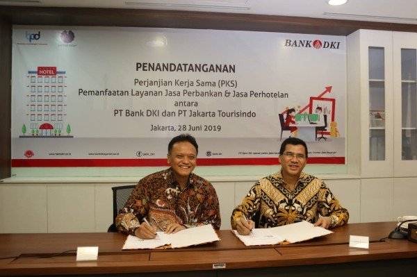 Direktur Teknologi & Operasional PT Bank DKI, Priagung Suprapto (kiri) dan Direktur Utama PT Jakarta Tourisindo, Geraard Jeffrey Z Rantung berfoto bersama usai melakukan penandatanganan Perjanjian Kerja Sama tentang Pemanfaatan Layanan Jasa perbankan & Jasa Perhotelan. Melalui kerja sama ini, Bank DKI akan memberikan fasilitas akses pembiayaan dan layanan e-channel seperti Cash Management System kepada PT Jakarta Tourisindo sebagai bentuk sinergi BUMD DKI Jakarta. (*)