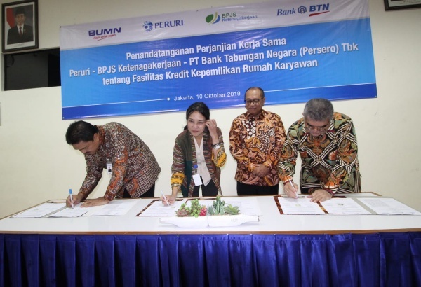 Direktur Consumer Bank BTN Budi Satria (kiri) memegang naskah kerja sama bersama Direktur Utama Peruri Dwina S. Kencanawati (tengah) dan Direktur Utama BPJS TK Agus Susanto (kanan) di Jakarta, Kamis (10/10). Ketiga perusahaan BUMN tersebut bersinergi untuk memberikan bantuan fasilitas rumah bagi pegawai Peruri yang berjumlah sekitar 1.900 orang dengan potensi KPR diperkirakan mencapai Rp750 Milyar hingga Rp1 Triliun. Sampai dengan 30 September 2019, Bank BTN telah menyalurkan pembiayaan perumahan untuk Program Sejuta Rumah sebanyak 610.499 unit dengan nilai kredit mencapai sekitar Rp50,736 triliun. (*)