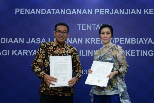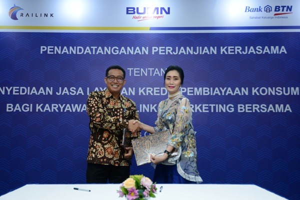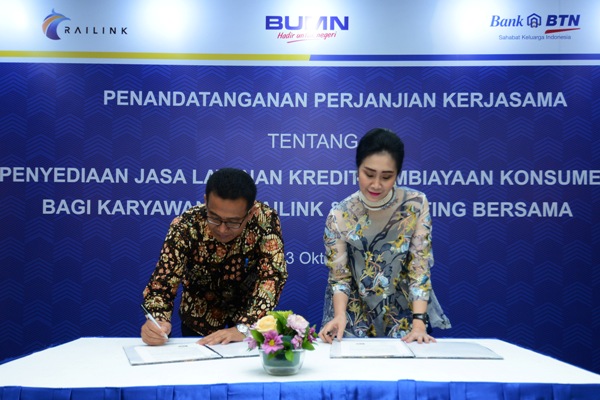 Managing Director PT Bank Tabungan Negara (Persero) Tbk. Handayani (kanan) bersama Direktur Utama PT Railink Heru Kuswanto berbincang usai menandatangani Perjanjian Kerja Sama (PKS) di Menara BTN, Jakarta, Jumat (13/10). Melalui kemitraan ini, karyawan Railink dapat mengakses berbagai kemudahan dan fasilitas kredit konsumer dari Bank BTN dengan bunga serta promosi menarik. Nasabah perseroan pun dapat membeli tiket Kereta Api Bandara menggunakan kartu Bank BTN. Adapun, per Agustus 2017, BBTN telah menyalurkan kredit konsumer (anaudited) senilai Rp143,99 triliun atau naik 19% secara tahunan dari Rp121,05 triliun pada Agustus 2016. (*)