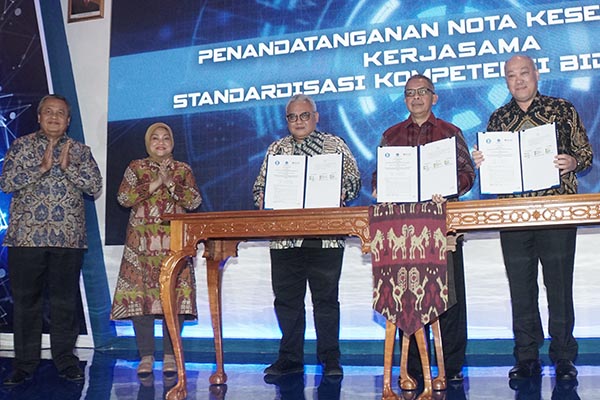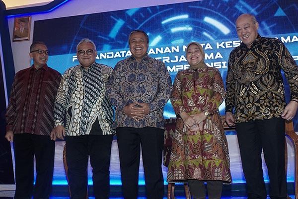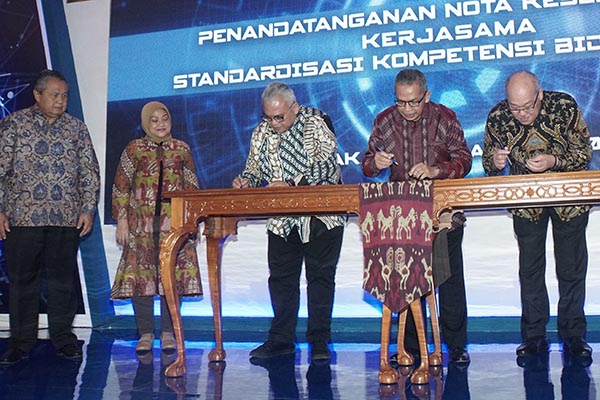 Gubernur Bank Indonesia Perry Warjiyo (kiri) bersama Menteri Tenaga Kerja Ida Fauziyah (kedua kiri) menyaksikan penandatanganan kerja sama  yang dilakukan antara Ketua Badan Nasional Sertifikasi Profesi (BNSP) Kunjung Masehat (dari kanan) bersama Deputi Gubernur Bank Indonesia Sugeng dan Dirjen Pembinaan Pelatihan dan Produktivitas Kemenaker Bambang Satrio Lelono di Jakarta, Senin 9 Maret 2020. Sinergi tersebut merupakan standarisasi kompetensi di Bidang Sistem Pembayaran dan Pengelolaan Uang Rupiah (SP-PUR) yang meliputi standarisasi kompetensi, penyiapan infrastruktur, pengawasan penyelenggara sertifikasi, penyediaan data atau informasi dan sosialisasi.