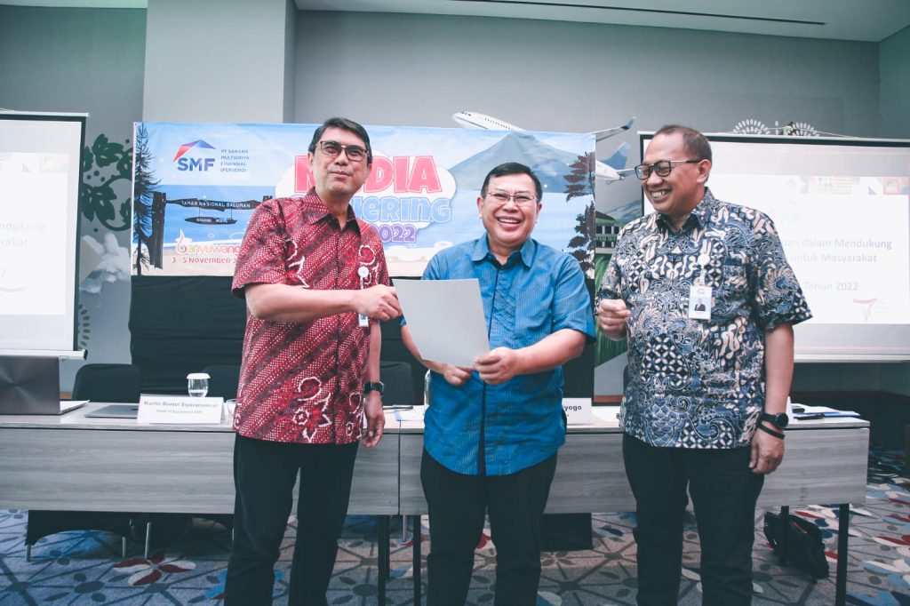Direktur Utama PT. Sarana Multigriya Finansial (Persero) atau SMF Ananta Wiyogo (kanan) bersama dengan Direktur SMF Bonai Subiakto (tengah) dan Chief Economist SMF Martin Daniel Siyaranamual sedang memberikan keterangan pada media terkait paparan kinerja Q3 SMF yang diadakan di Banyuwangi, Jawa Timur.Chief Economist SMF Martin Daniel Siyaranamual (kedua kiri) didampingi Direktur Utama PT. Sarana Multigriya Finansial (Persero) atau SMF Ananta Wiyogo (kedua kanan) bersama Direktur SMF Bonai Subiakto (tengah) dan Direktur SMF Heliantopo sedang memberikan keterangan pada media terkait paparan kinerja Q3 SMF yang diadakan di Banyuwangi, Jawa Timur.Direktur Utama PT. Sarana Multigriya Finansial (Persero) atau SMF Ananta Wiyogo (tengah) berbincang bersama dengan Direktur SMF Bonai Subiakto (kanan) dan Direktur SMF Heliantopo usai paparan kinerja Q3 SMF yang diadakan di Banyuwangi, Jawa Timur.Direktur Utama PT. Sarana Multigriya Finansial (Persero) atau SMF Ananta Wiyogo (tengah) berbincang dengan Direktur SMF Bonai Subiakto (kiri) dan Direktur SMF Heliantopo usai paparan kinerja Q3 SMF yang diadakan di Banyuwangi, Jawa Timur, Jum’at, 4 November 2022.