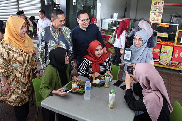 Group Head Digital Banking Sales and Partnership Mandiri Syariah Riko Wardhana (kedua kanan) bersama Region Head Mandiri Syariah Jakarta Deden Durachman (kedua kiri) dan Deputi Direktur Advisory Ekonomi & Keuangan Bank Indonesia, Diana Permatasari (kiri) tengah mensosialisasikan metode pembayaran kode respons cepat yang berstandar nasional atau dikenal sebagai Quick Response Code Indonesia Standard (QRIS) kepada mahasiswa Uhamka, di Jakarta 10 Maret 2020. Mandiri Syariah memudahkan kaum millennial yang sudah sangat familiar dengan gadget dan teknologi melakukan transaksi melalui metode pembayaran digital QRIS.