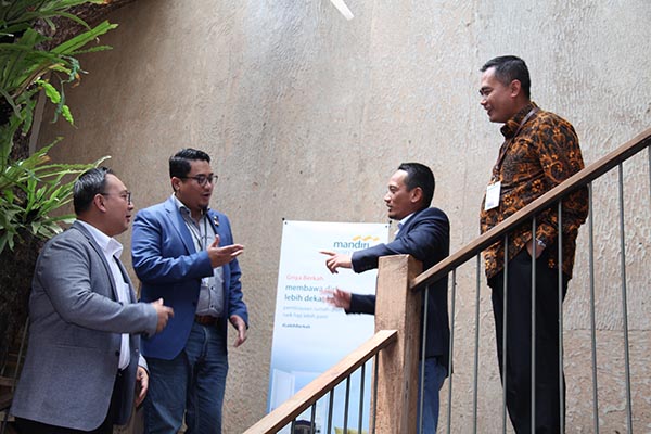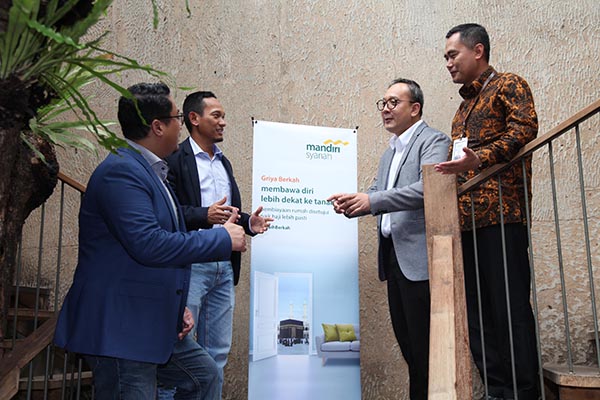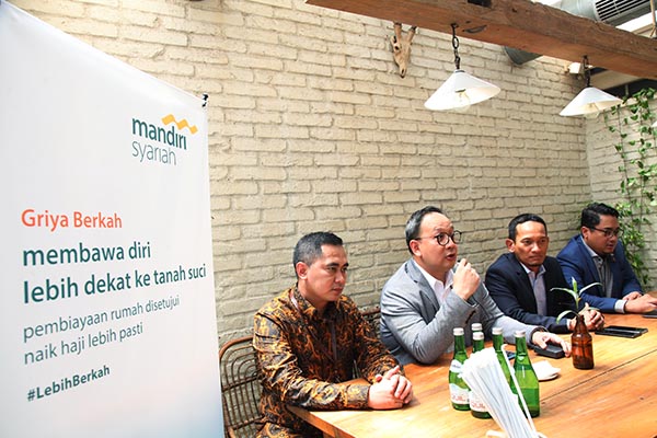Senior Executive Vice President (SEVP) Retail Banking Mandiri Syariah Wawan Setiawan (kedua kiri), berbincang bersama Corporate Secretary Ahmad Reza (kedua kanan), Group Head Consumer and Finance Praka Mulia Agung (kiri) dan Region Head III Jakarta Deden Durachman, disela peluncuran Griya Berkah, pembiayaan pemilikan rumah dengan hadiah porsi haji dalam bentuk Tabungan Mabrur, di Jakarta, Rabu 29 Januari 2020. Mandiri Syariah tidak hanya memberikan solusi pembiayaan pemilikan rumah dengan prinsip syariah namun juga memberikan kemudahan bagi nasabah untuk mewujudkan impian melaksanakan ibadah haji.