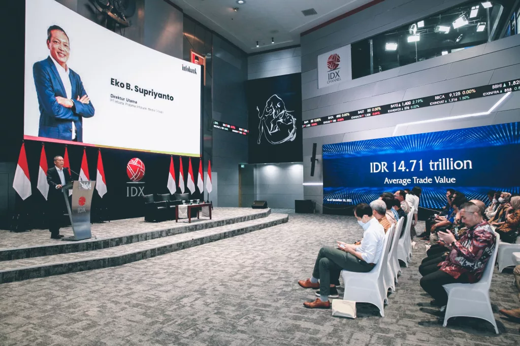 Direktur Utama PT. Infoarta Pratama (Infobank Media group) Eko B. Supriyanto, memberikan sambutan pada acara launching Reksa Dana Indeks STAR Infobank15, acara diselenggarakan di Main Hall Bursa Efek Indonesia Senin 1 Agustus 2023.
