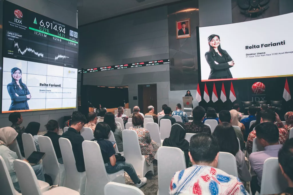 Direktur Utama PT. Surya Timur Alam Raya STAR Asset Management (STAR AM) Reita Farianti memberikan sambutan pada acara launching Reksa Dana Indeks STAR Infobank15, acara diselenggarakan di Main Hall Bursa Efek Indonesia Senin 1 Agustus 2023.
