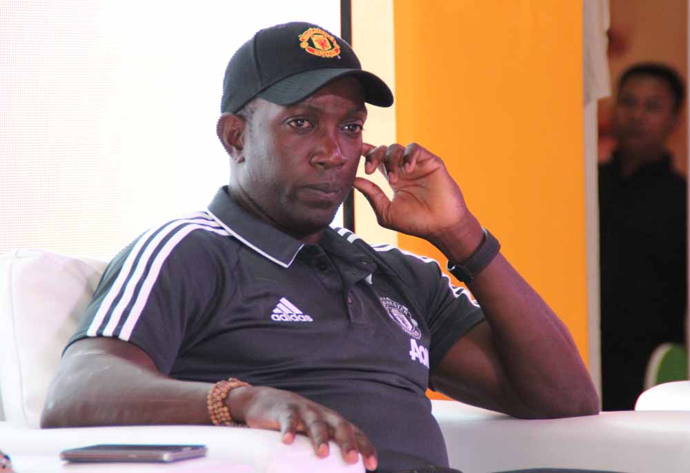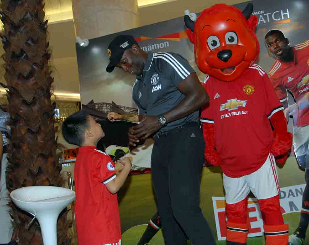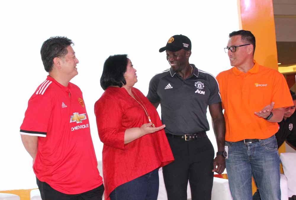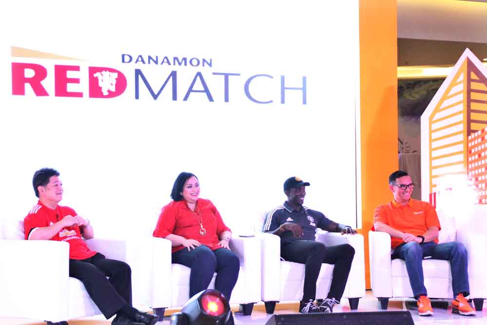 Direktur Consumer, SME & Branch Network PT Bank Danamon Indonesia Tbk Michellina Triwardhany (kedua kiri), Retail Banking Head Sonny Wahyubrata (kiri) dan Chief Marketing Officer Toni Darusman (kanan), berfoto bersama Legenda MU Dwight Yorke, pada peluncuran program Danamon Red Match Soccer Camp, di Jakarta, Jumat 4 Agustus 2017. Program Danamon Red Match Soccer Camp melengkapi program sebelumnya untuk para nasabah pemegang kartu Kredit Debit dan Kartu Kredit Manchester United yang bisa menyaksikan pertandingan Manchester Unted secara langsung di Old Trafford, Inggiris, sementara pprogram Danamon Red Match Soccer Camp ditujukan bagi para anak nasabah Danamon berusia 7-12 tahun yang membuka rekening TabunganMU dengan saldo minimum Rp25, maka dapat berlatih sepakbola di Manchester United Soccer School.