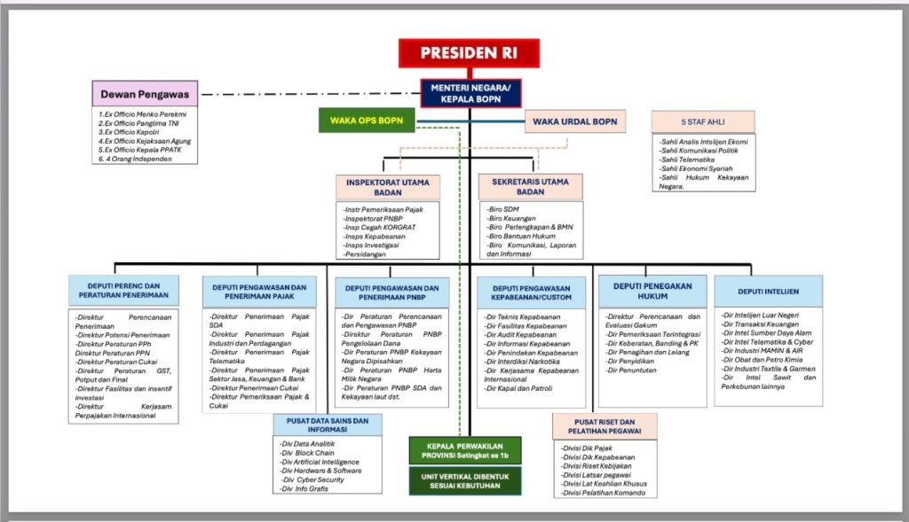 Selanjutnya, dalam BOPN akan ada Deputi Perencanaan dan Peraturan Penerimaan, Deputi Pengawasan dan Penerimaan Pajak, Deputi Pengawasan dan Penerimaan Penerimaan Negara Bukan Pajak (PNBP), Deputi Pengawasan Kepabeanan/Costum, Deputi Penegakan Hukum, Deputi Inteluen.