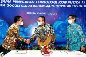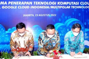 Direktur IT & Digital PT Bank Tabungan Negara (Persero) Tbk. Andi Nirwoto (tengah) bersama Country Sales Director Google Cloud Indonesia Anang Efendy (kiri), dan Director Account Management FSI & Commercial PT. Multipolar Technology, Tbk. Herryyanto (kanan) menunjukan naskah Perjanjian Kerja Sama Penerapan Teknologi Komputasi Cloud di Jakarta, Selasa (23/8). Bank BTN terus melakukan inovasi di sisi digital terutama dalam menjawab kebutuhan pasar. Dengan teknologi cloud dari kemitraan tersebut, Bank BTN berupaya menyediakan layanan modern, terpercaya, dan nyaman terutama bagi nasabah milenial.
