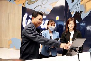 Direktur Utama Bank Mandiri Darmawan Junaidi (kiri) dan Wadirut Bank Mandiri Alexandra Askandar (kanan) sedang mendengarkan penjelasan seorang general banker saat seremoni cabang digital yang baru saja diresmikan di Bintaro, Tangerang Selatan, Jumat (29/7). Bank Mandiri melanjutkan transformasi digital dengan menghadirkan 241 cabang digital (smart branch) secara serentak di seluruh Indonesia melalui inovasi cabang yang didesain untuk dapat mengakomodir kebutuhan nasabah berdasarkan tingkat adopsi digital dengan mengintegrasikan digital channel (livin’ dan kopra) dan self service machine. Untuk mendukung inisiatif digitalisasi cabang ini, Bank Mandiri juga melakukan pengembangan karir SDM kantor cabang lewat program Mandirian Siap Jadi Digital dan tidak melakukan pengurangan pegawai sama sekali.