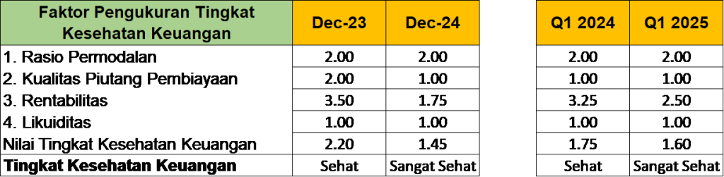 Perusahaan yang dipimpin Hendra Gunawan sebagai direktur utama ini menutup tahun kerja 2024 dengan total aset Rp649,40 miliar, atau meningkat 40,20 persen secara tahunan. Pencapaian positif itu juga dibarengi dengan rasio-rasio keuangan lain yang sehat. Lihat saja rasio financing to asset ratio (FAR) yang terbilang optimal di posisi 90,26 persen.