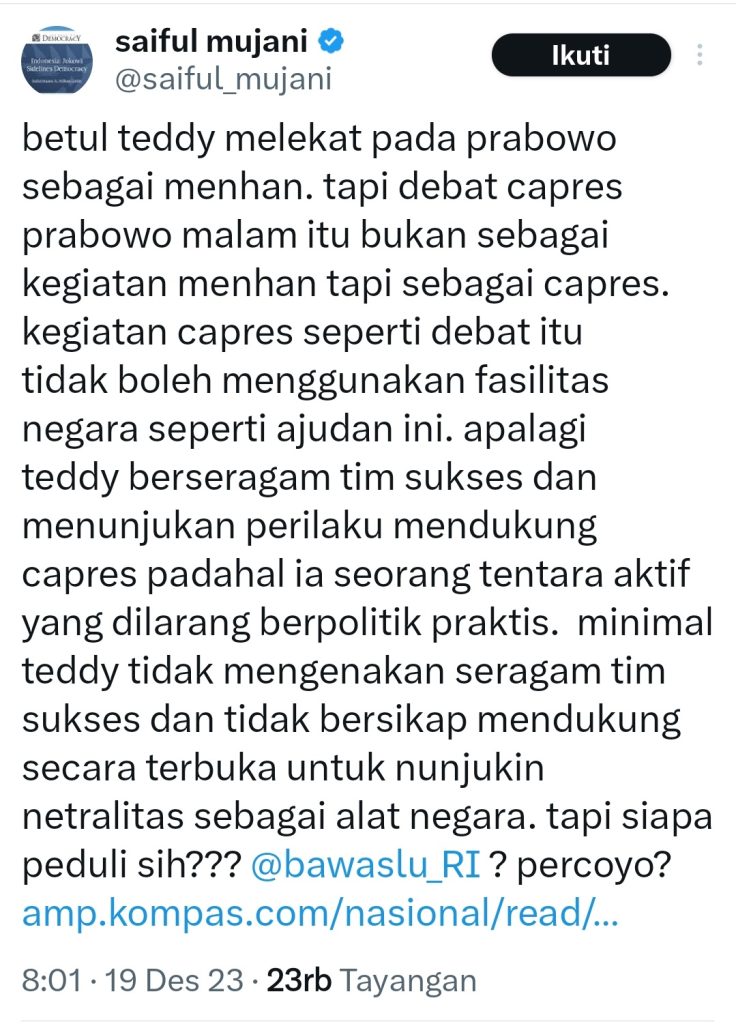“Betul Teddy melekat pada Prabowo sebagai Menhan. Tapi debat capres Prabowo malam itu bukan sebagai kegiatan Menhan tapi sebagai capres. Kegiatan capres seperti itu tidak boleh menggunakan fasilitas negara seperti ajunan ini. Apalagi Teddy berseragam tim sukses dan menunjukkan perilaku mendukung capres padahal ia seorang tentara aktif yang dilarang berpolitik praktis,” tulis @saiful_mujani dikutip Selasa, 19 Desember 2023.