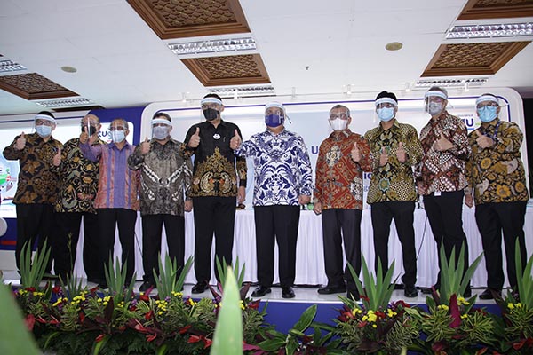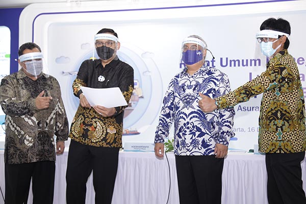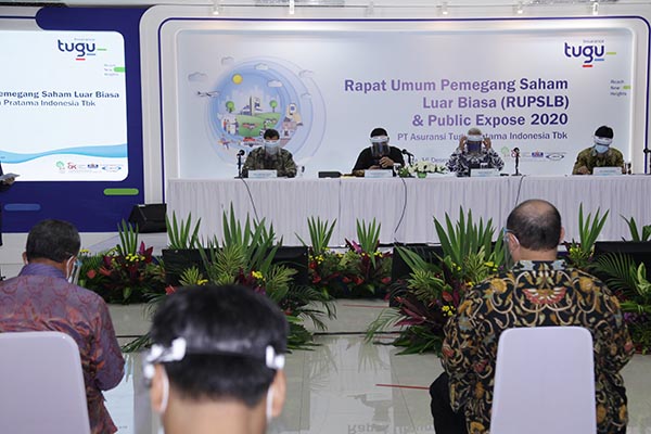 Presiden Direktur PT Asuransi Tugu Pratama Indonesia Tbk (Tugu Insurance) Indra Baruna (kedua kanan) berbincang dengan Komisaris Adi Zakaria Afiff (kiri), Presiden Komisaris Koeshartanto (kedua kiri) dan Direktur Pemasaran Asuransi Non Migas, Ery Widiatmoko (kanan) sesaat sebelum Rapat Umum Pemegang Saham Luar Biasa (RUPS-LB) dan Public Expose (PUBEX) Tugu Insurance 2020 di Jakarta, Rabu, 16 Desember 2020. Ditengah dampak resesi ekonomi, pelemahan aktivitas bisnis, dan kondisi pasar modal yang tidak kondusif, ditambah lagi adanya penurunan harga minyak yang sangat signfikan disepanjang tahun ini, PT Asuransi Tugu Pratama Indonesia Tbk (Tugu Insurance) masih mampu mencatatkan Laba Bersih Tahun Berjalan sebesar Rp 235.1 miliar hingga akhir September 2020.