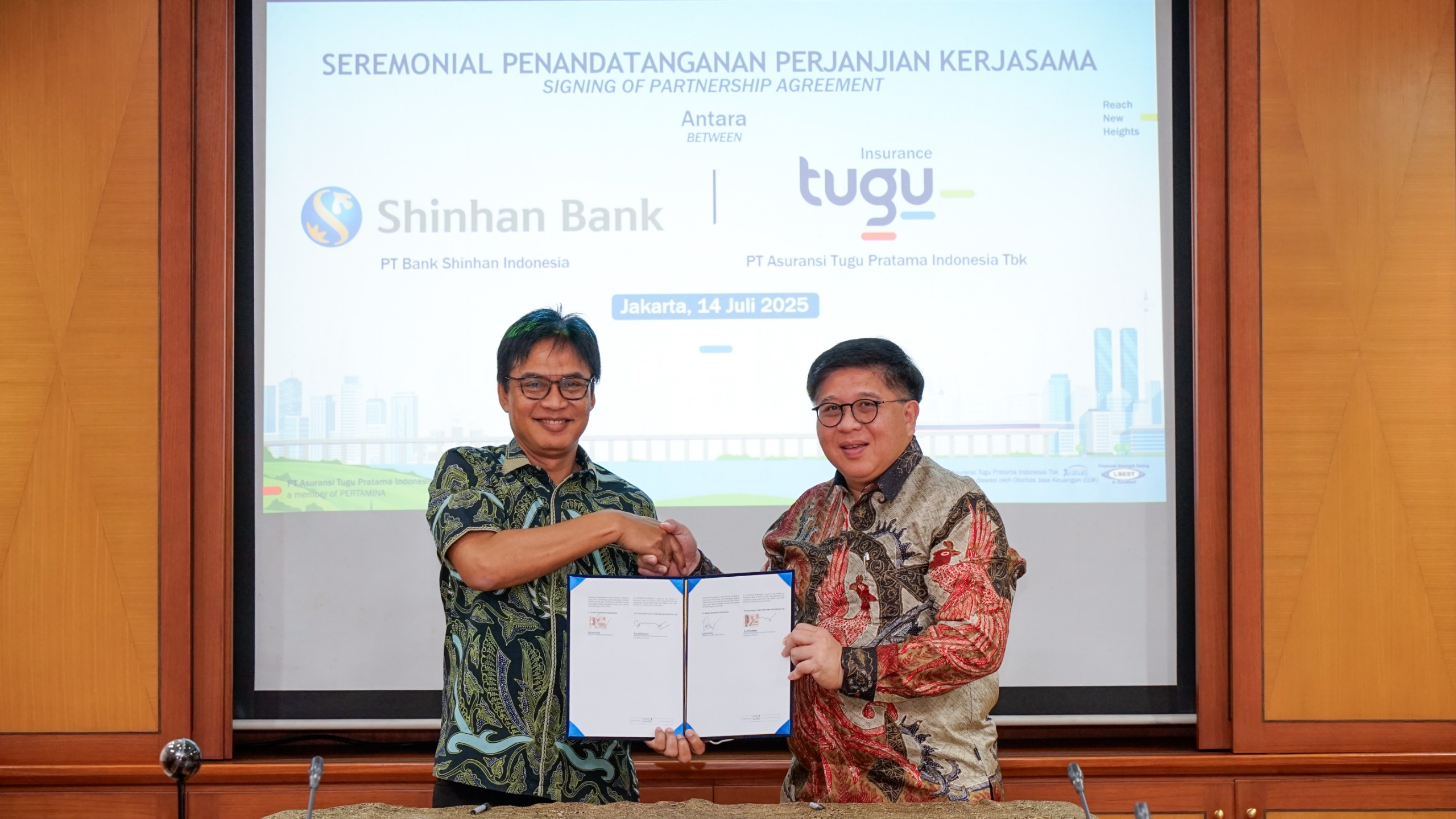 Penandatanganan kerja sama dilakukan oleh Direktur Pemasaran Tugu Insurance, Ery Widiatmoko, dan Direktur Kredit Bank Shinhan Indonesia, Leonard Auly.