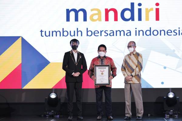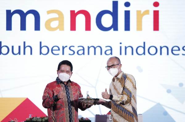 Wakil Dirut Bank Mandiri Hery Gunardi tengah memotong tumpeng saat perayaan HUT ke-22 Bank Mandiri serta disaksikan Komisaris Utama Bank Mandiri Chatib Basri (kanan) di Jakarta, Jumat 2 Oktober 2020. Perayaan HUT yang dihadiri jajaran direksi dan komisaris ini juga diwarnai kegiatan pemecahan rekor MURI untuk pemotongan tumpeng terbanyak secara virtual sebanyak 1.022 tumpeng dari berbagai kantor cabang di seluruh Indonesia. Tak hanya itu, Bank Mandiri juga berbagi kebahagiaan dengan masyarakat melalui penyerahan 12.000 paket sembako kepada masyarakat di sekitar 12 kantor wilayah dan bantuan APD senilai Rp1 miliar untuk tenaga kesehatan.