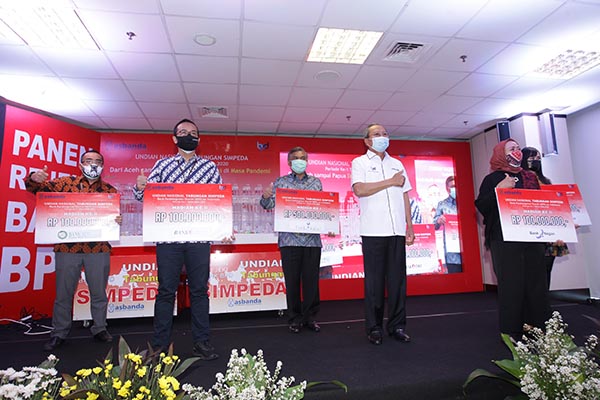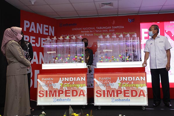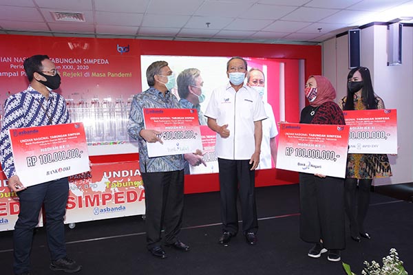 Direktur Eksekutif Asosiasi Bank Pembangunan Daerah (Asbanda) Wimran Ismaun (kanan) berbincang dengan para perwakilan bank pemenang undian saat kegiatan Undian Nasional Tabungan Simpeda di Jakarta, Selasa 8 September 2020. Sebagai bentuk sinergi Bank Pembangunan Daerah (BPD) di Indonesia, Asbanda menyelenggarakan Undian Nasional Tabungan Simpeda yang dikemas dalam tajuk Panen Rejeki Bank Pembangunan Daerah (BPD). Dalam undian Panen Rejeki Bank BPD kali ini hadiah utama Rp 500 juta dimenangkan oleh nasabah Bank Kalsel, kemudian hadiah kedua masing-masing Rp 100 juta untuk 4 pemenang dimenangkan oleh nasabah Bank BPD Bali, Bank DKI, Bank BPD DIY, dan Bank Nagari.