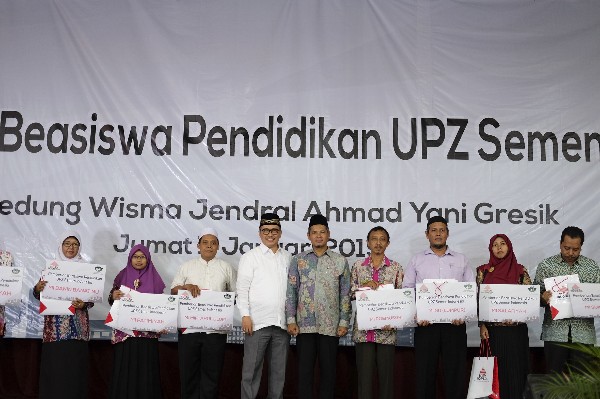 Direktur SDM dan Hukum Semen Indonesia Agung Yunanto (kiri berbaju putih) secara simbolis menyerahkan beasiswa kepada perwakilan siswa di Wisma A. Yani Gresik, Jumat (11/1). Unit Pengumpul Zakat (UPZ) PT Semen Indonesia (Persero) Tbk menyalurkan bantuan beasiswa pendidikan sebesar Rp926.658.000 kepada 716 siswa dari 71 sekolah tingkat SD, SMP,SLTA dan Perguruan Tinggi yang ada diKabupaten Gresik. Tujuan pemberian beasiswa ini untuk mendukung keberlangsungan pendidikan bagi siswa-siswi maupun mahasiswa dan mahasiswi dari keluarga yang kurang mampu, Semoga dengan bantuan beasiswa ini membuat para penerima kian bersemangat dalam belajar untuk mencapai apa yang diinginkan. (*)