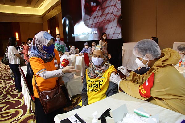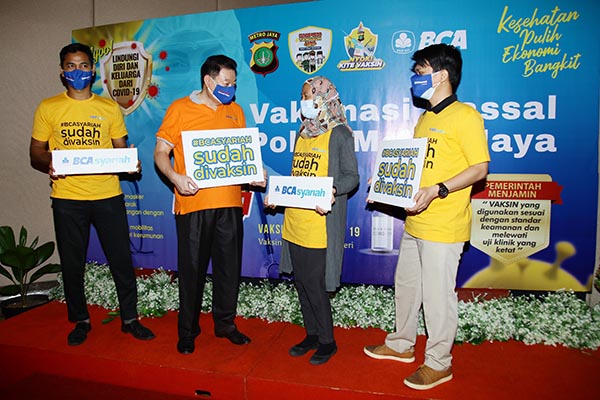 Kepala Satuan kerja TI dan Logistik BCA Syariah Yohanes Oetomo (kiri) tengah menyaksikan kegiatan vaksinasi karyawan BCA Syariah yang diadakan di Jakarta, Senin, 14 Juni 2021. Sebanyak 200 karyawan BCA Syariah mengikuti kegiatan Vaksinasi Kampung Tangguh Jaya (KTJ) Polda Metro Jaya. Kegiatan ini merupakan sinergi antara Polda Metro Jaya, BCA dan anak usaha BCA dalam rangka mendukung percepatan pelaksanaan program vaksinasi pemerintah untuk melindung masyarakat dari Covid-19. Kegiatan vaksinasi tersebut diikuti oleh 1.600 karyawan BCA dan anak usaha BCA yang berlokasi di wilayah Jakarta.