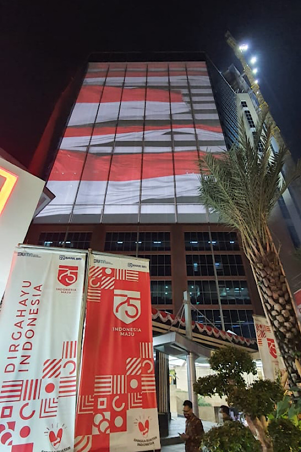 Bank BRI menampilkan Video Mapping dan logo HUT Kemerdekaan ke-75 RI melalui layar LCD raksasa di Gedung Kantor Pusat Bank BRI di jalan Jend. Sudirman Jakarta yang digelar dalam rangkaian perayaan dan peringatan HUT RI ke 75, Selasa (18/08). BRI memaknai HUT kemerdekaan Indonesia dengan spirit bangkit untuk menggapai Indonesia yang lebih maju. Mengambil peran melalui kegiatan Corporate Social Responsibility (CSR) BRI Peduli memberikan Dana Bantuan Pendidikan (Beasiswa) kepada 5.000 pelajar berprestasi dan tidak mampu di seluruh Indonesia mulai dari SD, SMP, MTs, SMA atau sederajat termasuk diantaranya anak/cucu dari Veteran Pejuang dan tenaga pendukung medis dari RS Rujukan Penanganan Covid-19, seperti tenaga kebersihan RS, Supir Ambulans, Petugas Pemulasaraan dan para Pekerja Dasar RS non-Pekerja Tetap. (*)